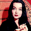 Description: Carolyn Jones' Morticia, in color, looking at the camera as she holds a cup of tea.